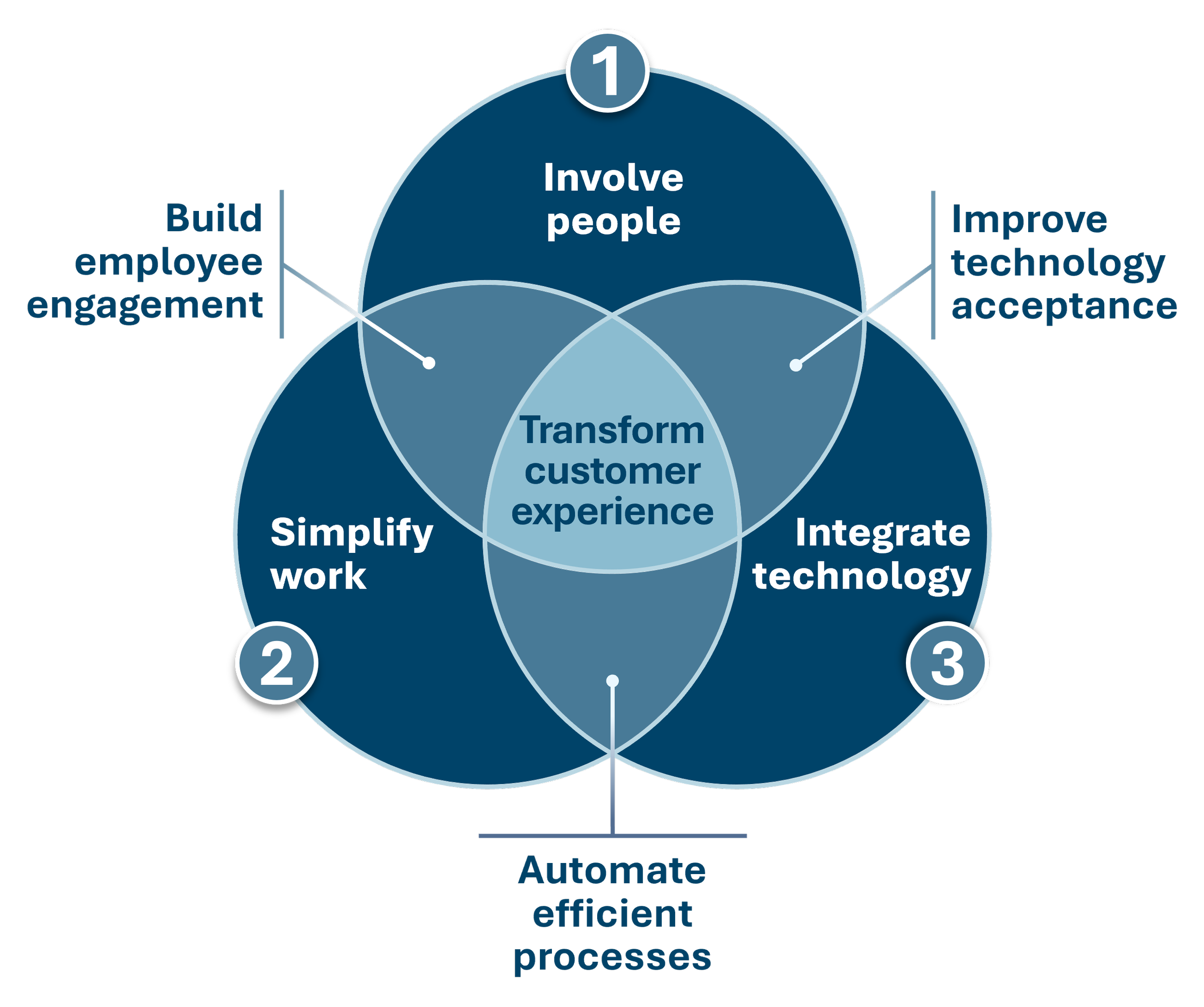 Many organizations try to fix problems in isolation — upgrading technology without simplifying the process; or changing the process without engaging people; or engaging people without fixing broken processes and systems.